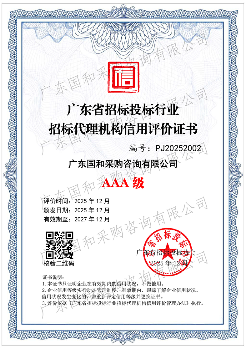 近日,广东省招标投标协会公布了广东省招标投标行业招标代理机构信用评价结果,我公司荣获广东省招标投标行业招标代理机构信用评价AAA级证书!这一荣誉是行业对我公司在招标代理领域专业能力、信用体系建设和规范经营方面卓越表现的权威认可,更是对国和咨询团队长期坚守诚信、精益求精的肯定。